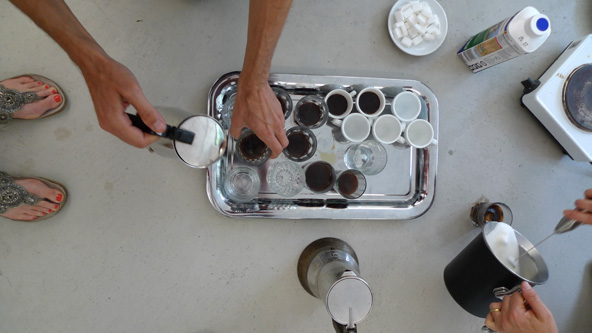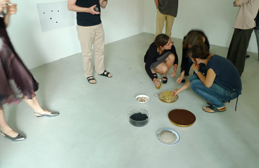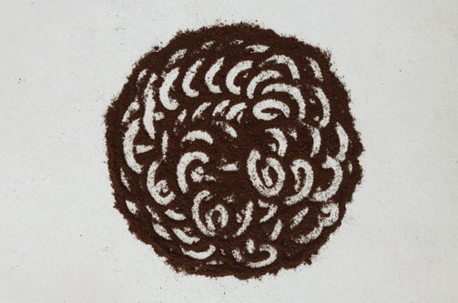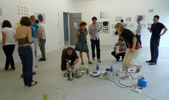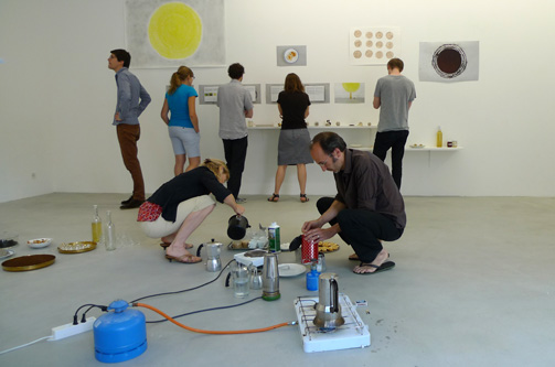Ein weiterer Anlass war die "öffentliche Kaffeepause". Für ca. 20 Besucher kochten wir auf mehreren Gaskochern und Herdplatten Kaffee. Die Kaffeepause nahm während des letzten Jahres eine wichtige Rolle in meiner Arbeit ein und führte zu Texten, Fotos und Zeichnungen. Den Kaffeesatz des konsumierten Kaffees und somit auch die "Reste" der verbrachten Zeit sammle ich und arbeite dann damit weiter. Die "öffentliche Kaffeepause" ist eine Weiterführung davon; man kann sie wie ein Multiple oder eine Vergrösserung meiner eigenen Kaffeepause sehen. Die Installation und die Aktion verknüpft sich mit den Bildern und Objekten im Raum, in welchen der Kaffee als Material wieder auftaucht.