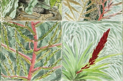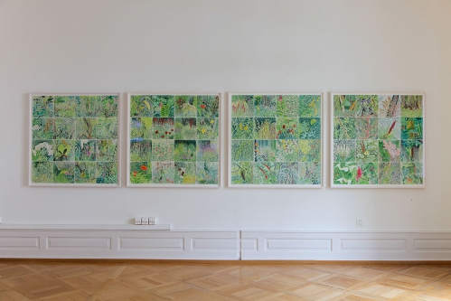 Hier habe ich meine Atelierarbeit nach Manier der klassischen Pleinairmalerei in den Botanischen Garten verlegt. Regelmässig und zu festgesetzten Zeiten malte ich im Botanischen Garten in Basel ein kleinformatiges Aquarell. Dabei beschäftigte mich der Anachronismus der Naturmalerei und die Frage nach ihrer Berechtigung heute. Die Arbeit vereint tägliche Routine mit der romantischen Vorstellung des Malens in der Natur. Die eigene Produktivität steht dem Wachstum der Pflanzen im Garten gegenüber. Die einzelnen Aquarelle bilden jeweils einen Ausschnitt des Gartens ab und werden im Atelier chronologisch, wie in einem Tagebuch zu einem neuen künstlichen Garten montiert, der Pflanzen aus aller Welt, in allen Jahreszeiten integriert.