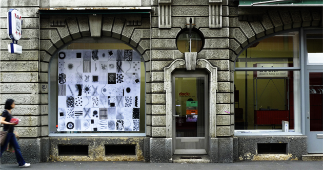 "Punkte, Stäbe, Schlaufen, Strahlen" entstand für das Schaufenster des Dock - aktuelle Kunst in Basel. Siebzig kopierte Zeichnungen und überarbeitete Direktkopien wurden zu einer fensterfüllenden Komposition gefügt. Die Stoss an Stoss aneinander gehängten Zeichnungen erzeugen ein dichtes Gewebe aus sich verwandelnden Linien, Punkten, Stäben und Strahlen in der das Auge wandern, sich verirren und immer wieder neue Kombinationen entdecken kann. Anlässlich der Eröffnung erschien KAP-Q Nr.1, ein kopiertes Magazin in Zusammenarbeit mit Nicole Boillat. In einer Gesamtauflage von 100 entstanden sechs verschiedene Magazine, in der die Motive unterschiedlich kombiniert wurden.