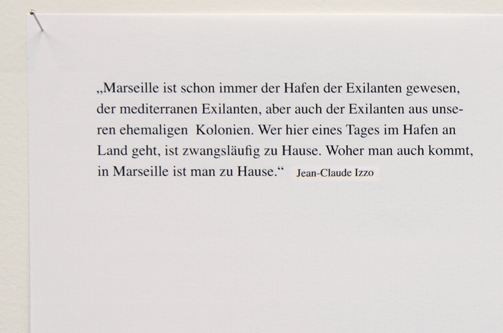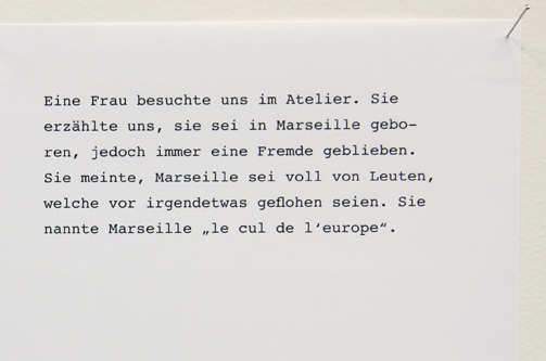 Für die Ausstellung „Going Places – Marseille“ entwickelten wir eine Rauminstallation aus Fotos, Videos und Textfragmenten. Während eines viermonatigen Aufenthaltes in Marseille sammelten wir eigene Bilder und Texte sowie Ausschnitte aus Filmen und Büchern, die in Marseille spielen. Uns interessierte dabei die Stadt als Projektionsfläche: Die Stadt wird erfunden durch all die, welche sie betrachten, durchstreifen oder auch nur von ihr hören. Die Gerüchte und Ideen liegen wie ein Schleier über der Stadt. Was ist wahr? Was erfunden? Wer kennt die Stadt wirklich? Welche Teile erschliessen sich wem? Wer hat die Macht Dinge über die Stadt zu behaupten? Welche Gerüchte und Ideen setzen sich durch? Wer hat die Macht die Stadt zu formen? Wo vermischen sich Realität und Imagination?